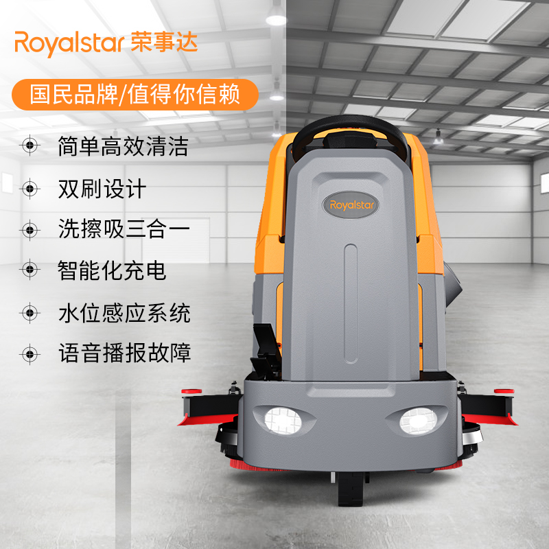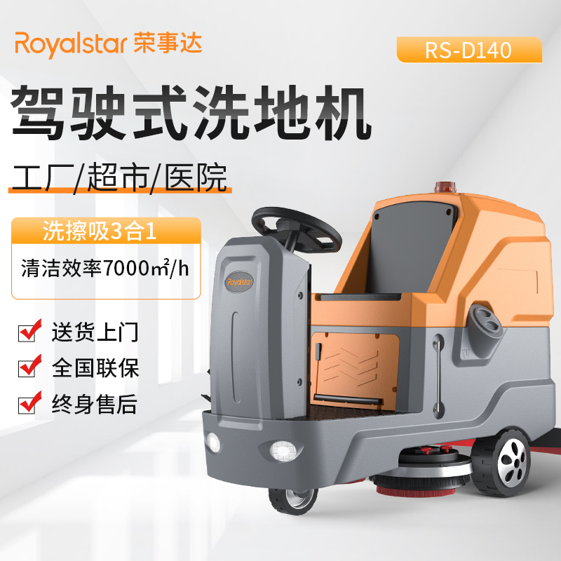 榮事達駕駛式洗地機RS-D140,電動駕駛洗地機車,清潔效率高,使用的是鋁鑄吸水扒,更加高壓耐磨抗撞擊可以實現180旋轉,吸污效果更好,百潔墊使用進口尼龍絲,高密度用料多,耐磨損的同時使用壽命也更長,而且不易變形,清洗效果好。...