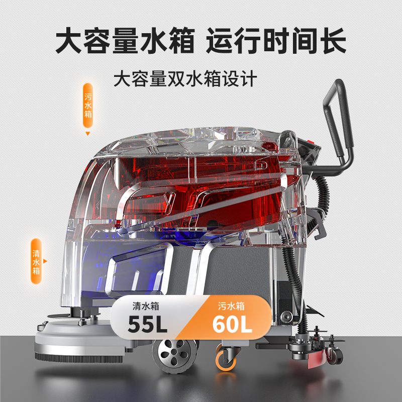 榮事達洗地機手推式RS-M40,強效電機過載保護性能峰值穩定,加大水箱長效清潔,提升了清掃寬度,清洗效率更高,可以實現68分貝靜音作業,設備配備了浮球感應裝置,可以起到保護電機的作用,當污水達到一定程度時,可以自動停止工作,防止污水進入電機。...